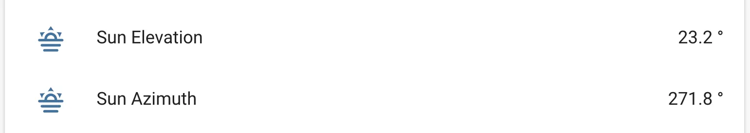 # Example configuration entrysensor: - platform: sun name: Sun Elevation type: elevation - platform: sun name: Sun Azimuth type: azimuth